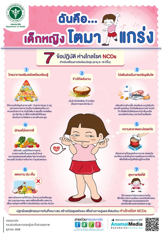 เนื่องในวันเด็กหญิงสากล ตรงกับวันที่ 11 ตุลาคมทุกปี หนูรู้จึง อยากแบ่งปัน วิธีดูแลสุขภาพ ตั้งแต่วัยเด็ก หากฝึกให้กินเป็น ปลูกฝังพฤติกรรมการกินที่เหมาะสม สร้างวินัยดูแลตัวเอง เพื่อร่างกายสูงและดีสมส่วน ห่างไกลโรค NCDs เริ่มจาก 7 ข้อปฏิบัติ สำหรับ เพื่อนสาววัยเรียนวัยรุ่น (อายุ 6-18 ขึ้นปี) ของหนูรู้ทุกคน