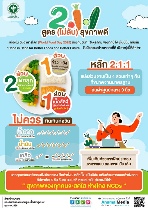 🏥 ซึ่งเป็นโอกาสอันดี ที่กรมอนามัย ขอเชิญชวน ❝ทุกครอบครัว❞ ร่วมใจกันแบ่งปันความรอบรู้ด้านโภชนาการจากมือเราสู่มือคนที่รัก โดย แบ่งสัดส่วนจาน 2 : 1 : 1 และ การลดหวาน มัน เค็ม กินไม่เกินต่อวัน โดยมีหลักปฏิบัติดังนี้