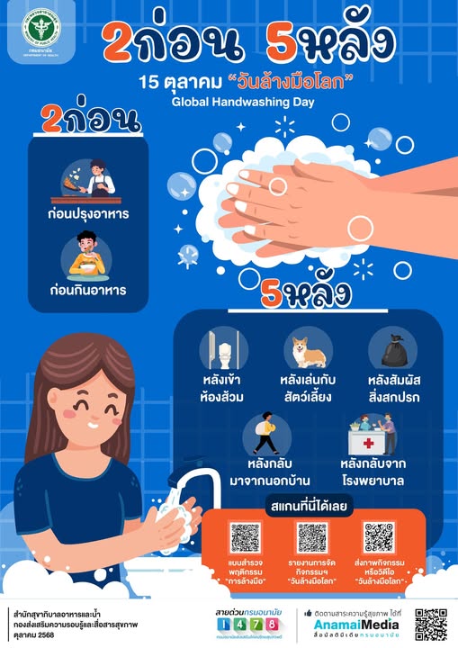 ทุกวันที่ 15 ตุลาคม ของทุกปีเป็น “วันล้างมือโลก” (Global Handwashing Day) กรมอนามัยขอเชิญชวนทุกท่านร่วม “ล้างมืออย่างถูกวิธีด้วยน้ำและสบู่” 🧼💧