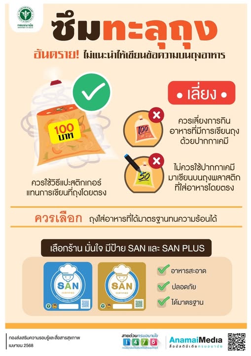 🏥 กรมอนามัย แนะเลือกใช้วิธีบอกชนิดของอาหารในบรรจุภัณฑ์ รวมไปถึงการเลือกร้านอาหารที่ผ่านการรับรองมาตรฐานจาก กรมอนามัย ได้ที่ป้าย SAN และ SAN PLUS เพื่อแสดงถึงว่า ร้านนี้ให้บริการ ❝อาหารสะอาด ปลอดภัย ได้มาตรฐาน❞