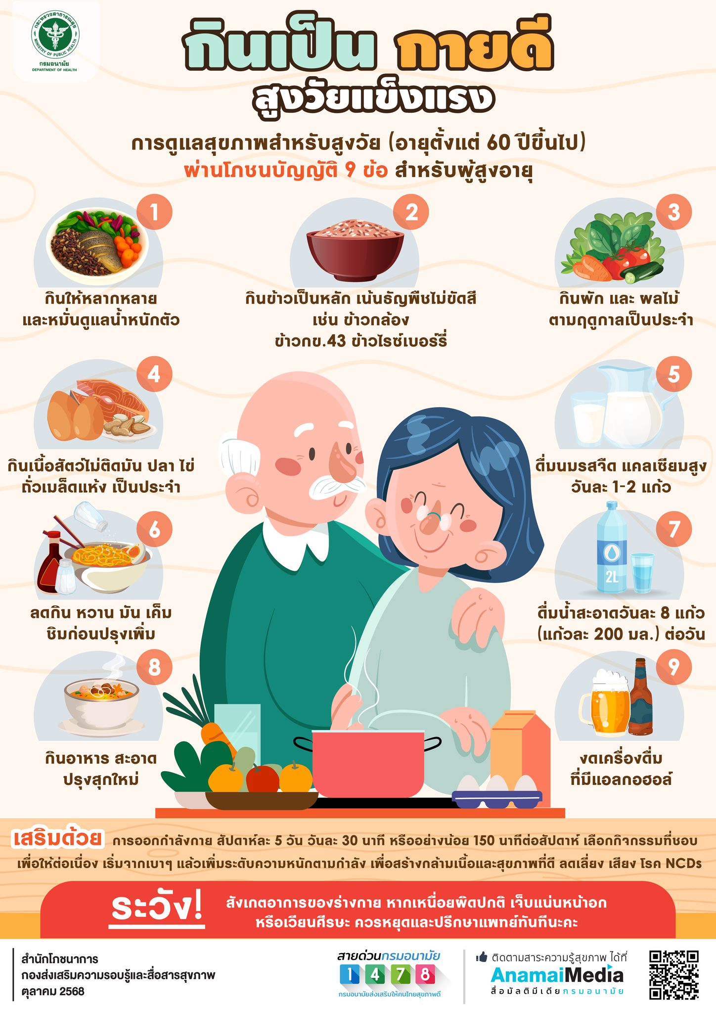 🏥 แต่วันนี้กรมอนามัยจะเน้นไปที่การดูแลสุขภาพสำหรับสูงวัย (อายุตั้งแต่ 60 ปีขึ้นไป) ผ่าน โภชนบัญญัติสำหรับผู้สูงอายุ 9 ข้อ ดังนี้